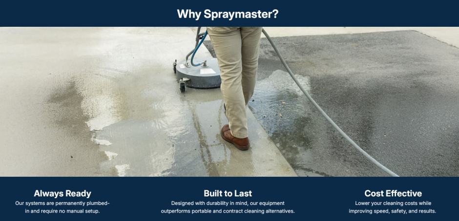 Spraymaster is a leading manufacturer of electric-powered commercial pressure washer systems built for everyday use in high-traffic environments. For decades, SprayMaster supported businesses in optimizing their cleaning routines with reliable, plumbed-in solutions that minimize downtime and simplify operations.